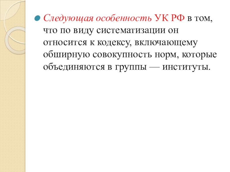 Слайд 9Следующая особенность УК РФ в том, что по виду систематизации он относится