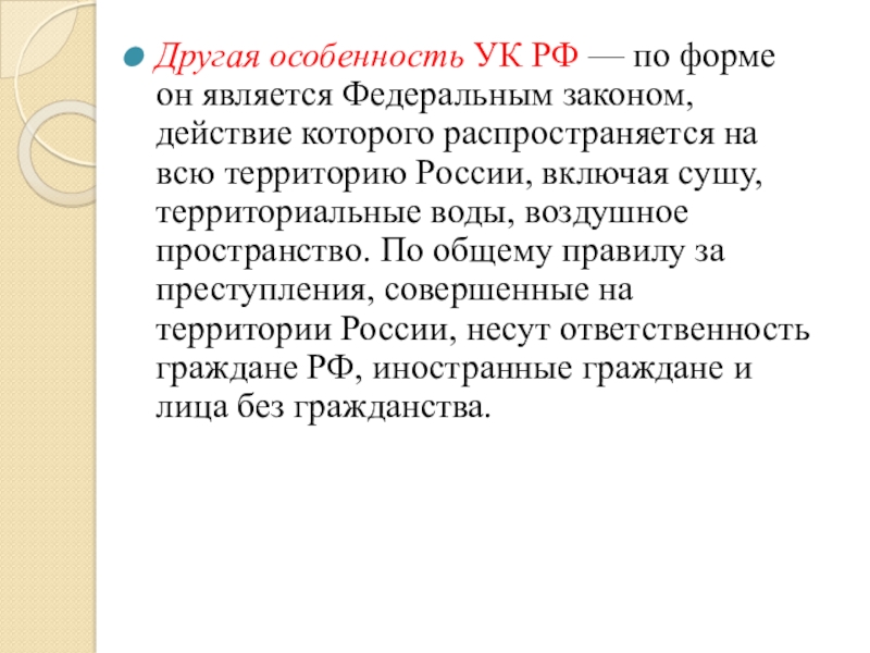 Слайд 8Другая особенность УК РФ — по форме он является Федеральным законом, действие