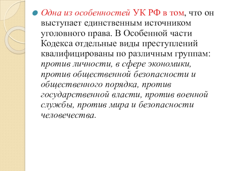Слайд 7Одна из особенностей УК РФ в том, что он выступает единственным источником
