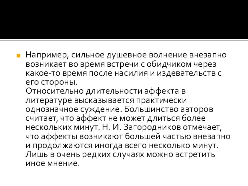 Относительно длительности аффекта в литературе высказывается практически однозначное суждение. Большинство авторов считает, что аффект не может длиться более нескольких минут. Н. И. Загородников отмечает, что аффекты возникают большей частью внезапно и продолжаются иногда всего несколько минут. Лишь в очень редких случаях можно встретить иное мнение.
