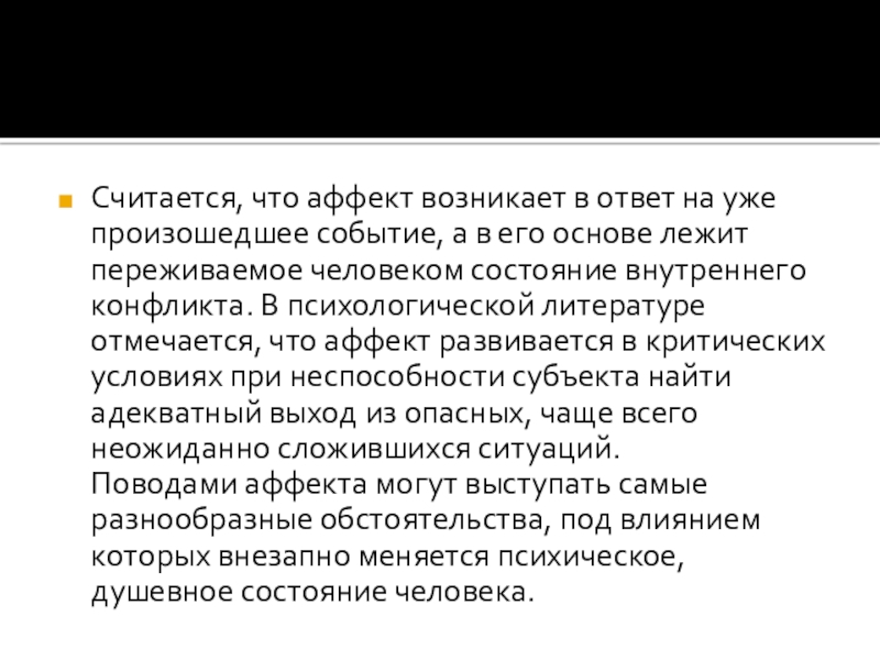 в его основе лежит переживаемое человеком состояние внутреннего конфликта. В психологической литературе отмечается, что аффект развивается в критических условиях при неспособности субъекта найти адекватный выход из опасных, чаще всего неожиданно сложившихся ситуаций.