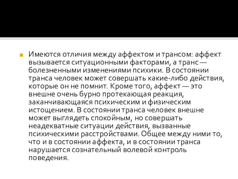 Слайд 10Имеются отличия между аффектом и трансом: аффект вызывается ситуационными факторами, а