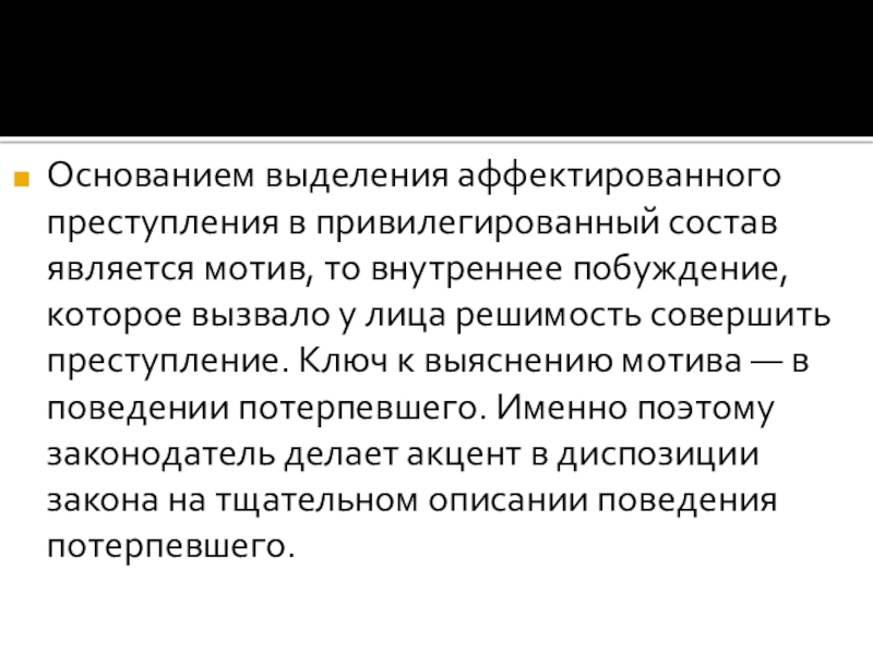 Слайд 22Основанием выделения аффектированного преступления в привилегированный состав является мотив, то внутреннее