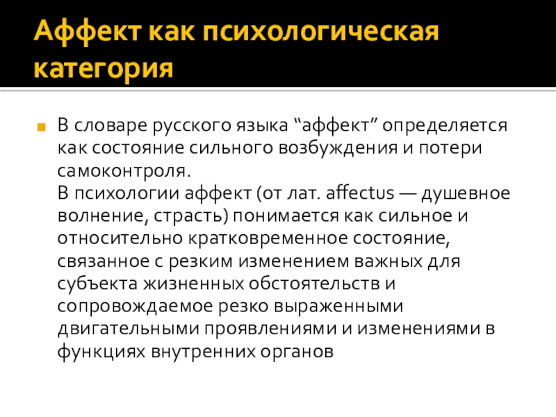 В психологии аффект (от лат. affectus — душевное волнение, страсть) понимается как сильное и относительно кратковременное состояние, связанное с резким изменением важных для субъекта жизненных обстоятельств и сопровождаемое резко выраженными двигательными проявлениями и изменениями в функциях внутренних органов