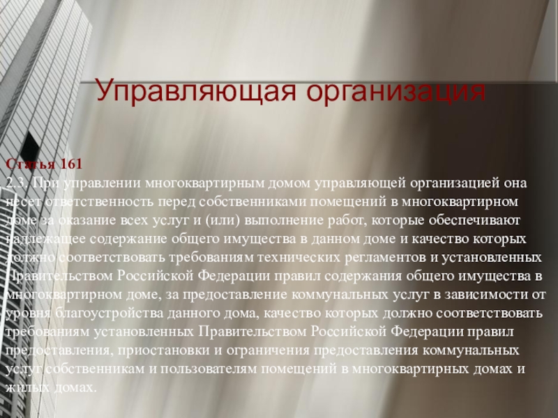 Слайд 3Статья 161. Выбор способа управления многоквартирным домом. Общие требования к деятельности