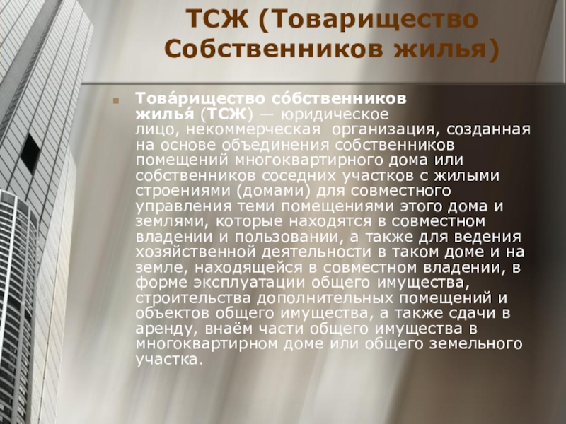 Слайд 6ТСЖ (Товарищество Собственников жилья)