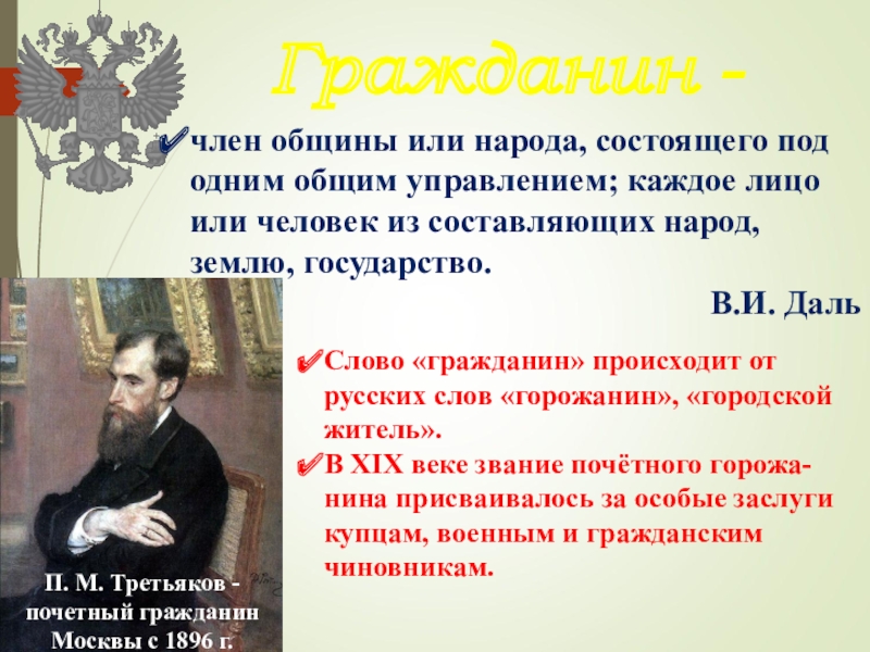 Слово «гражданин» происходит от русских слов «горожанин», «городской житель».