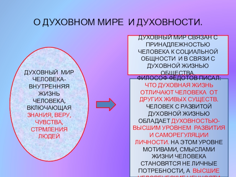 ФИЛОСОФ ФЕДОТОВ ПИСАЛ: ЧТО ДУХОВНАЯ ЖИЗНЬ ОТЛИЧАЮТ ЧЕЛОВЕКА ОТ ДРУГИХ ЖИВЫХ СУЩЕСТВ. ЧЕЛОВЕК С РАЗВИТОЙ ДУХОВНОЙ ЖИЗНЬЮ ОБЛАДАЕТ ДУХОВНОСТЬЮ- ВЫСШИМ УРОВНЕМ РАЗВИТИЯ И САМОРЕГУЛЯЦИИ ЛИЧНОСТИ. НА ЭТОМ УРОВНЕ МОТИВАМИ, СМЫСЛАМИ ЖИЗНИ ЧЕЛОВЕКА СТАНОВЯТСЯ НЕ ЛИЧНЫЕ ПОТРЕБНОСТИ, А ВЫСШИЕ ЧЕЛОВЕЧЕСКИЕ ЦЕННОСТИ