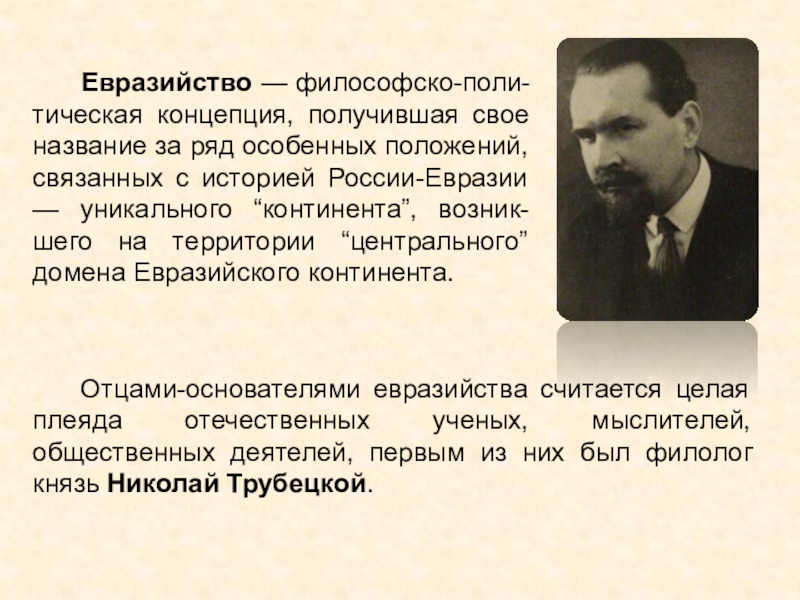 Отцами-основателями евразийства считается целая плеяда отечественных ученых, мыслителей, общественных деятелей, первым из них был филолог князь Николай Трубецкой.