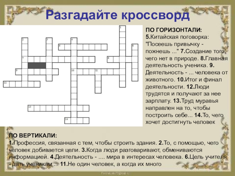1.Профессия, связанная с тем, чтобы строить здания. 2.То, с помощью, чего человек добивается цели. 3.Когда люди разговаривают, обмениваются информацией. 4.Деятельность - .... мира в интересах человека. 6.Цель учителя - дать ученикам ... 11.Не один человек, а когда их много