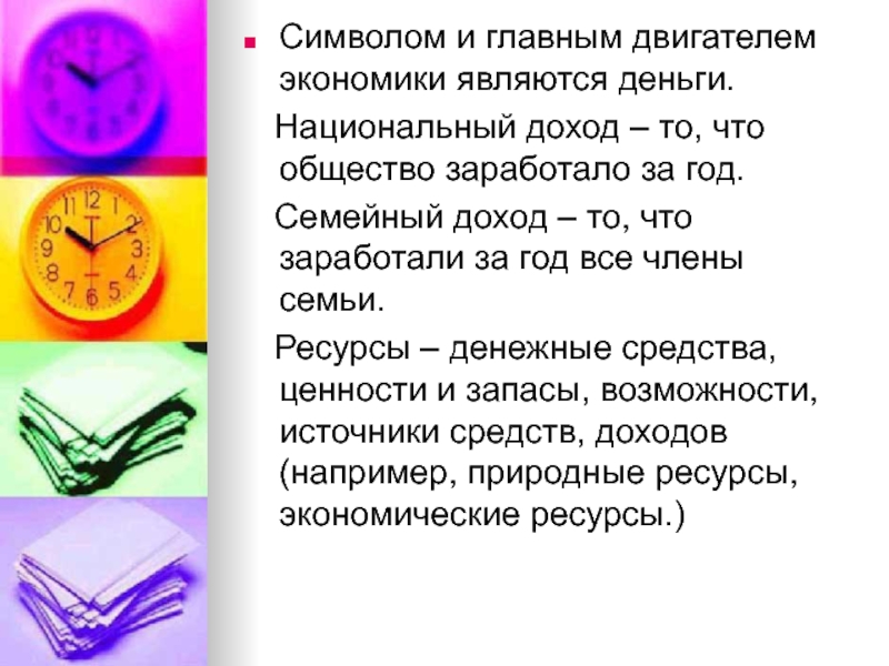 Символом и главным двигателем экономики являются деньги.  Национальный доход – то, что общество заработало за год.