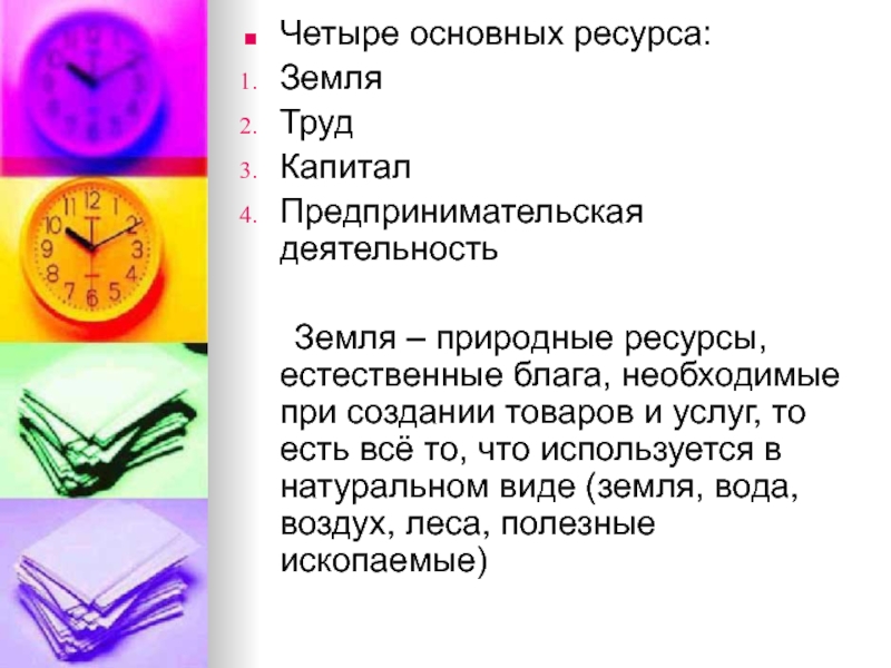 Четыре основных ресурса: ЗемляТруд КапиталПредпринимательская деятельность   Земля – природные ресурсы, естественные блага, необходимые при создании