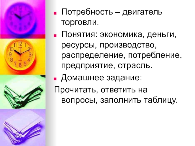 Потребность – двигатель торговли.Понятия: экономика, деньги, ресурсы, производство, распределение, потребление, предприятие, отрасль.Домашнее задание:Прочитать, ответить на вопросы, заполнить