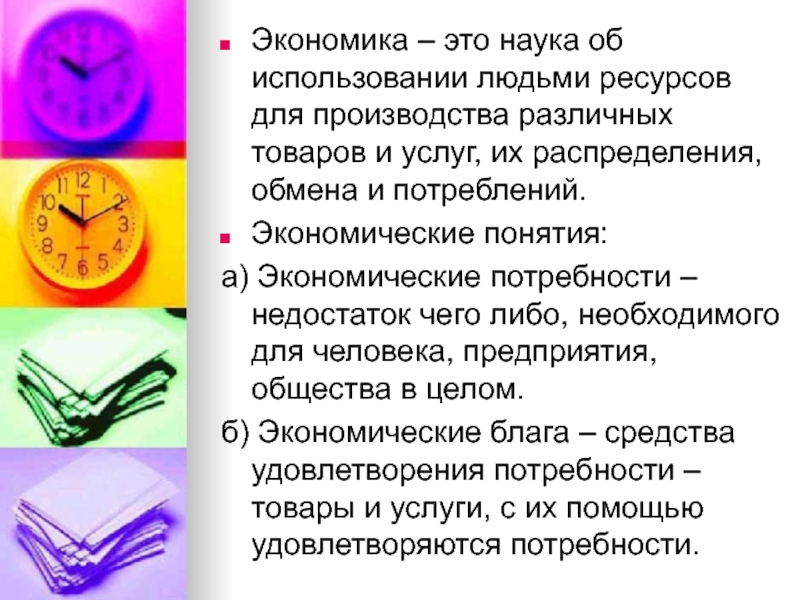 Экономика – это наука об использовании людьми ресурсов для производства различных товаров и услуг, их распределения, обмена и потреблений.Экономические понятия:а) Экономические потребности – недостаток чего либо, необходимого для человека, предприятия, общества в целом.б) Экономические блага –