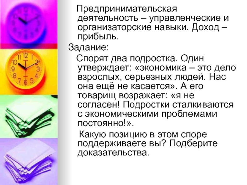 Предпринимательская деятельность – управленческие и организаторские навыки. Доход – прибыль.Задание:   Спорят два подростка.