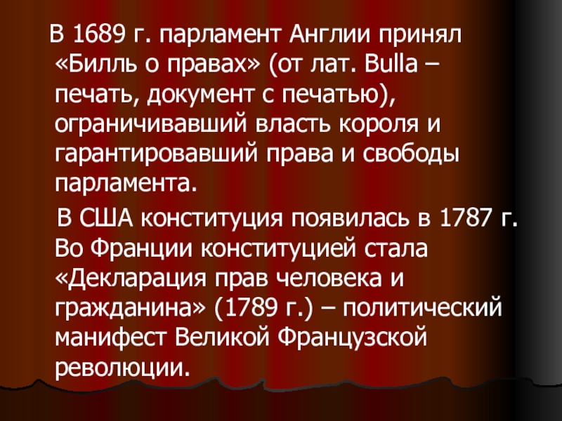 В 1689 г. парламент Англии принял «Билль о правах» (от лат. Bulla – печать, документ с