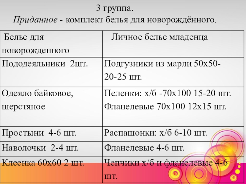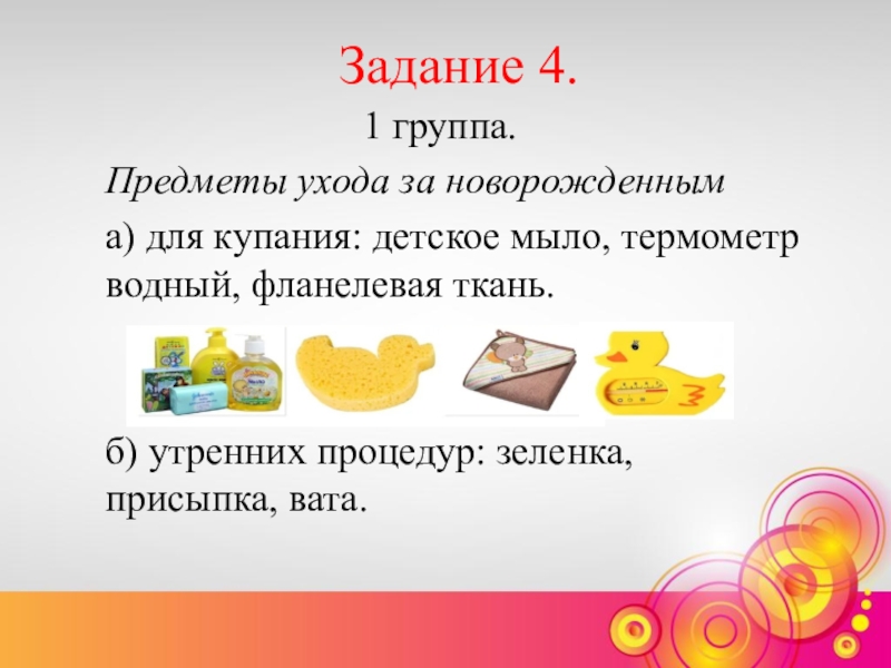 а) для купания: детское мыло, термометр водный, фланелевая ткань.