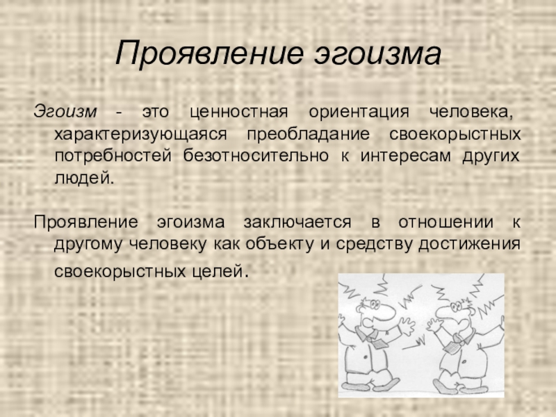 Проявление эгоизма заключается в отношении к другому человеку как объекту и средству достижения своекорыстных целей.