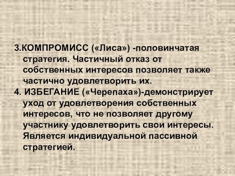 3.КОМПРОМИСС («Лиса») -половинчатая стратегия. Частичный отказ от собственных интересов позволяет также