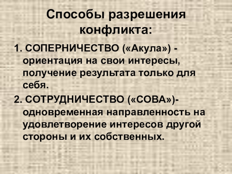 1. СОПЕРНИЧЕСТВО («Акула») - ориентация на свои интересы, получение