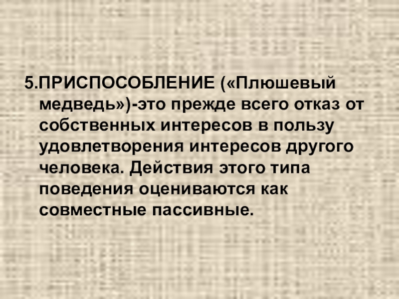 5.ПРИСПОСОБЛЕНИЕ («Плюшевый медведь»)-это прежде всего отказ от собственных интересов в пользу
