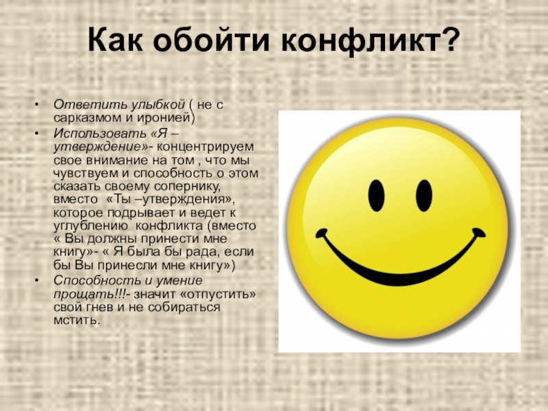 –утверждение»- концентрируем свое внимание на том , что мы чувствуем и способность о этом сказать своему сопернику, вместо «Ты –утверждения», которое подрывает и ведет к углублению конфликта (вместо « Вы должны принести мне книгу»- « Я была бы рада, если бы Вы принесли мне книгу»)