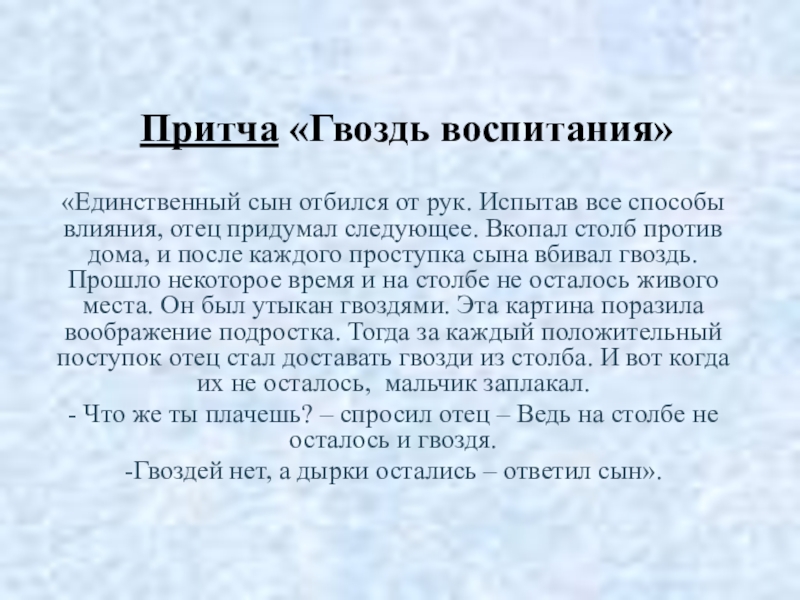 Притча «Гвоздь воспитания»«Единственный сын отбился от рук. Испытав все способы влияния, отец придумал следующее. Вкопал столб против
