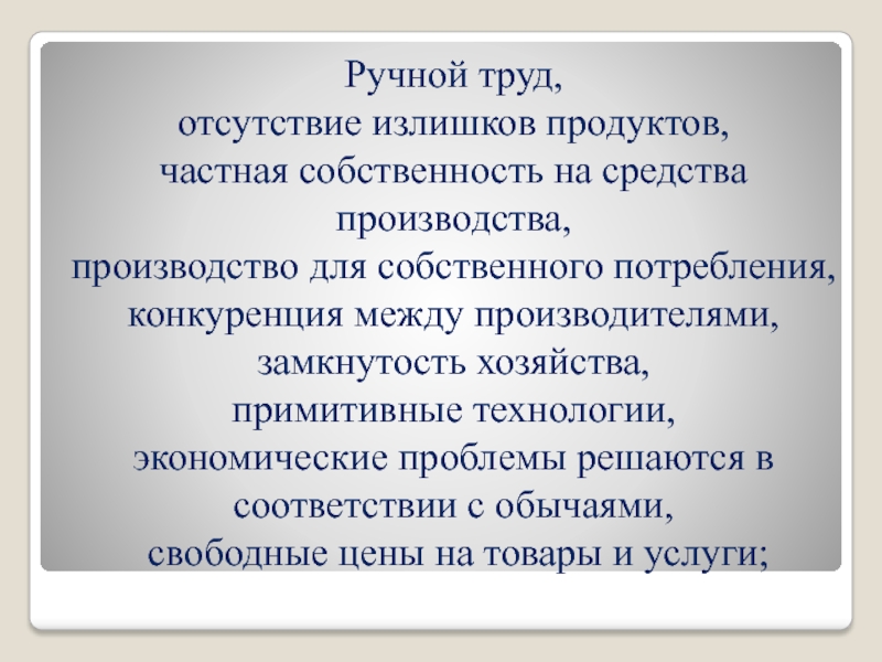 для собственного потребления, конкуренция между производителями, замкнутость хозяйства, примитивные технологии, экономические проблемы решаются в соответствии с обычаями, свободные цены на товары и услуги;