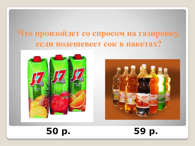 Что произойдет со спросом на газировку, если подешевеет сок в пакетах?50 р.59 р.