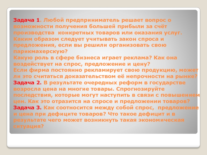 за счёт производства конкретных товаров или оказания услуг. Каким образом следует учитывать закон спроса и предложения, если вы решили организовать свою парикмахерскую? Какую роль в сфере бизнеса играет реклама? Как она воздействует на спрос, предложение и цену? Если фирма постоянно рекламирует свою продукцию, может ли это считаться доказательством её непрочности на рынке? Задача 2. В результате очередных реформ в государстве возросла цена на многие товары. Спрогнозируйте последствия, которые могут наступить в связи с повышением цен. Как это отразится на спросе и предложении товаров? Задача 3. Как соотносится между собой спрос, предложение и цена при дефиците товаров? Что такое дефицит и в результате чего может возникнуть такая экономическая ситуация?