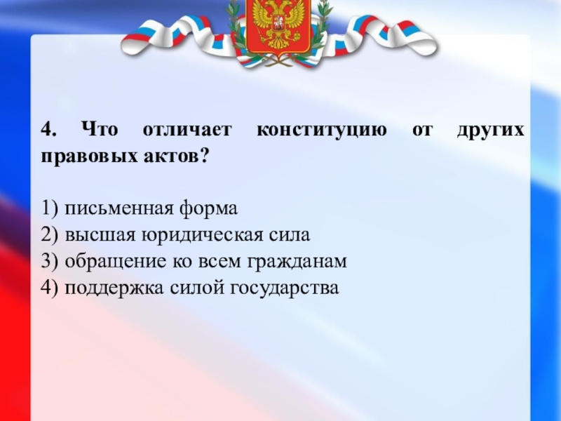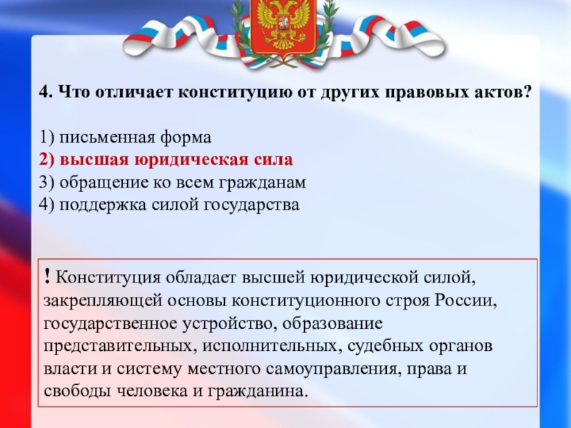 ! Конституция обладает высшей юридической силой, закрепляющей основы конституционного строя России, государственное устройство, образование представительных, исполнительных, судебных органов власти и систему местного самоуправления, права и свободы человека и гражданина.