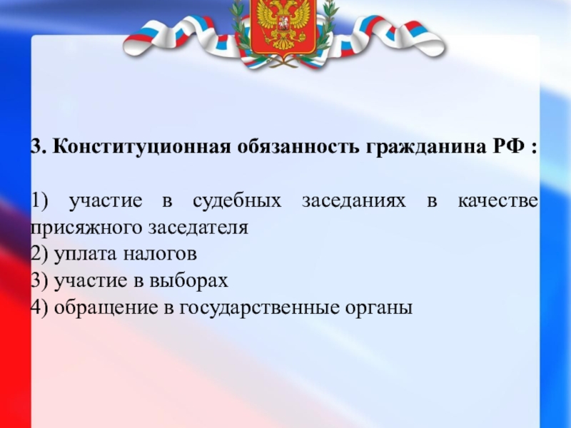 ! Статья 57 Конституции РФ обязывает каждого платить законно установленные налоги и сборы. Всё остальное — это права, а не обязанности.