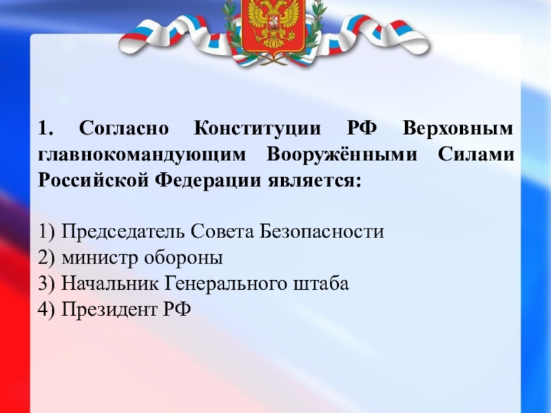 ! Согласно статье 87 Конституции Российской Федерации, Верховным Главнокомандующим Вооружёнными Силами Российской Федерации является Президент Российской Федерации.
