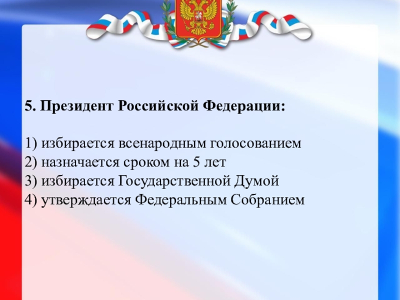! Президент Российской Федерации — высшая государственная должность РФ, а также лицо, избранное на эту должность. Президент РФ определяет основные направления внутренней и внешней политики. Президент России — единственная должность, на которую избирается один из кандидатов общим голосованием граждан РФ.
