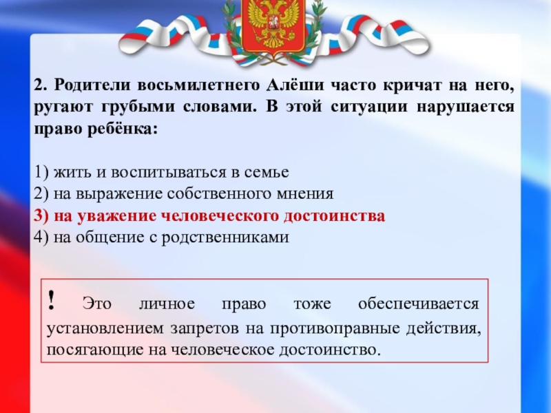 ! Это личное право тоже обеспечивается установлением запретов на противоправные действия, посягающие на человеческое достоинство.