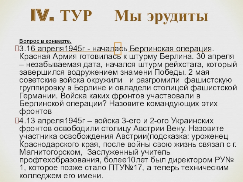 4.13 апреля1945г – войска 3-его и 2-ого Украинских фронтов освободили столицу Австрии Вену. Назовите участника освобождения Австрии(подсказка: уроженец Краснодарского края, после войны свою жизнь связал с г.Магнитогорском, Заслуженный учитель профтехобразования, более10лет был директором РУ№ 1, которое позже стало ПТУ№17, а теперь техническим колледжем его имени.