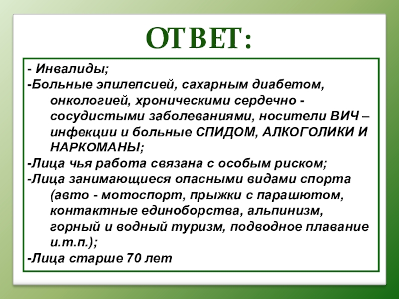 заболеваниями, носители ВИЧ – инфекции и больные СПИДОМ, АЛКОГОЛИКИ И НАРКОМАНЫ;