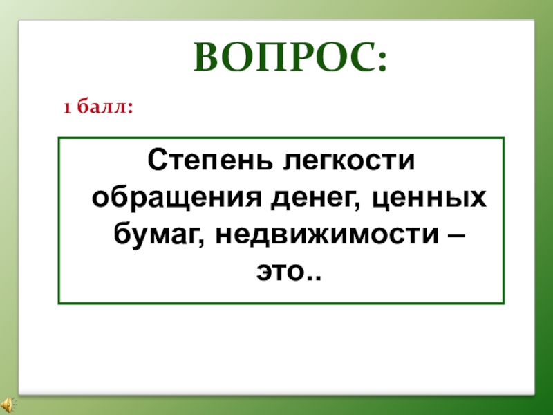 Слайд 89Степень легкости обращения денег, ценных бумаг, недвижимости – это..