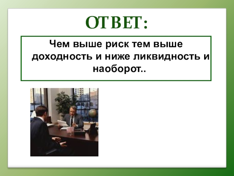 Слайд 102Чем выше риск тем выше доходность и ниже ликвидность и наоборот..