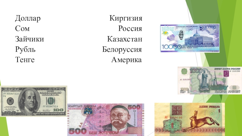 Слайд 11Доллар Киргизия Сом Россия Зайчики Казахстан Рубль Белоруссия Тенге Америка