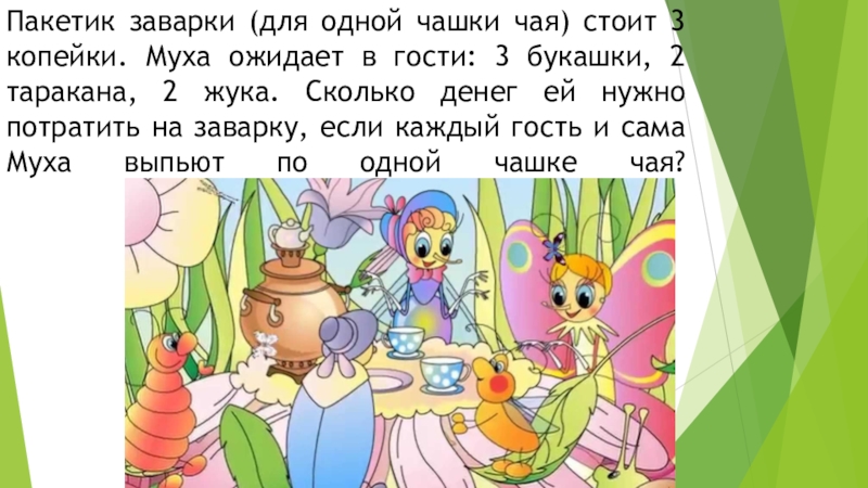 в гости: 3 букашки, 2 таракана, 2 жука. Сколько денег ей нужно потратить на заварку, если каждый гость и сама Муха выпьют по одной чашке чая?