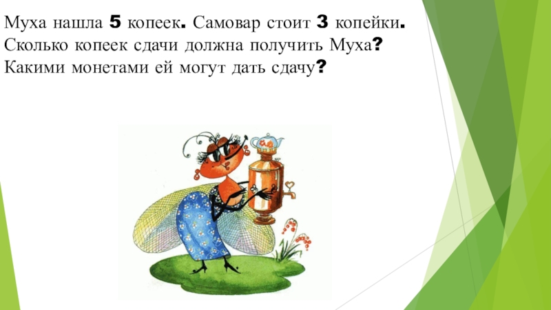 Слайд 12Муха нашла 5 копеек. Самовар стоит 3 копейки. Сколько копеек сдачи