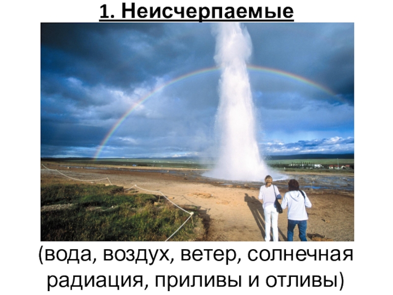 1. Неисчерпаемые(вода, воздух, ветер, солнечная радиация, приливы и отливы)