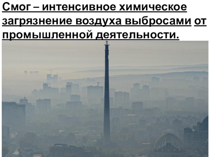 Слайд 17Смог – интенсивное химическое загрязнение воздуха выбросами от промышленной деятельности.