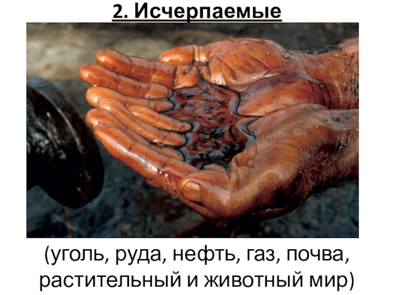 2. Исчерпаемые(уголь, руда, нефть, газ, почва, растительный и животный мир)