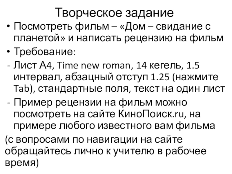 Творческое заданиеПосмотреть фильм – «Дом – свидание с планетой» и написать рецензию на фильмТребование:Лист А4, Time new