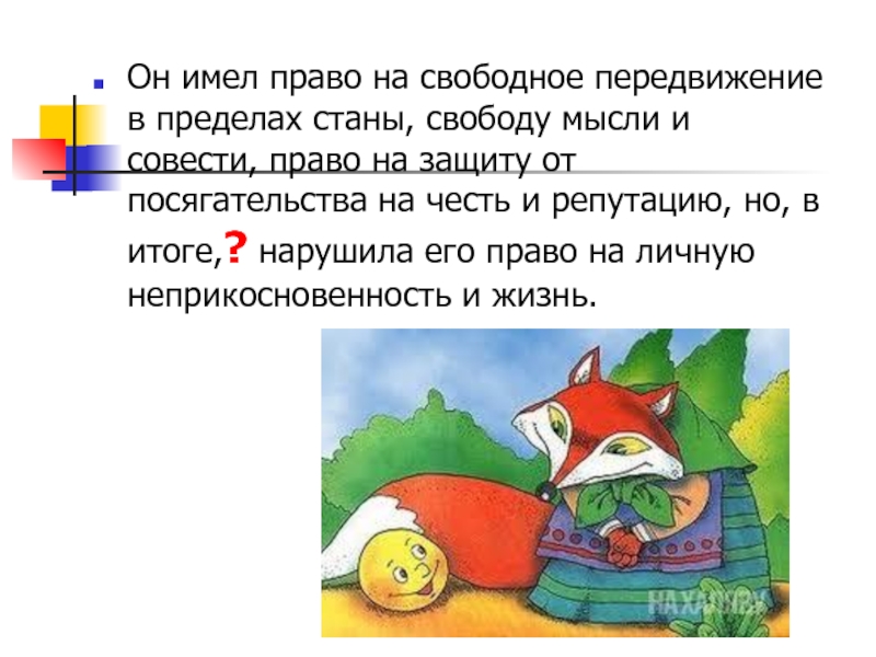 человека, затем стал сыном другого. Разбойники не раз нарушали личную неприкосновенность этого героя, право на жизнь и свободу, попытались завладеть его имуществом, а вот правом на образование он сам не воспользовался.