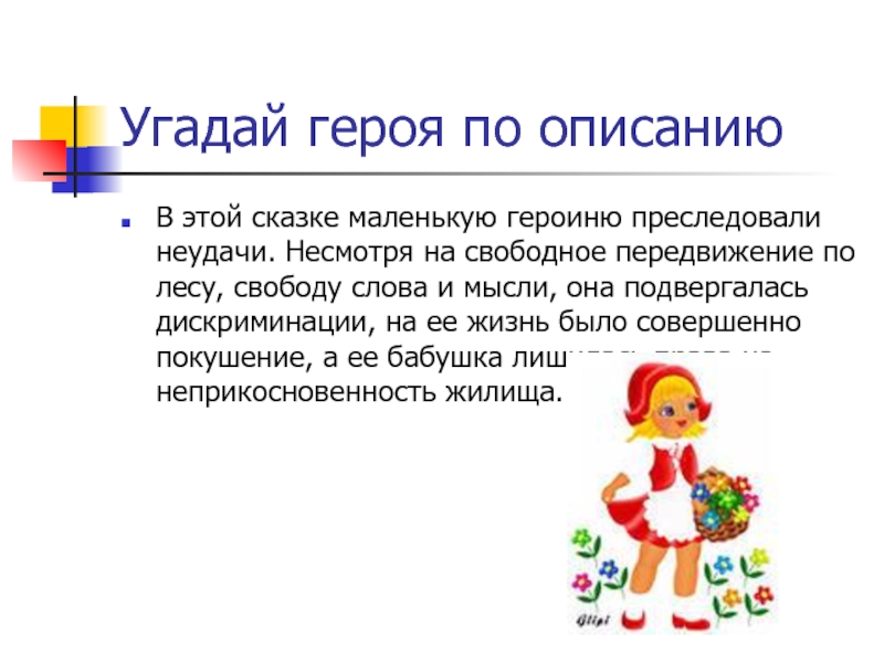 Несмотря на свободное передвижение по лесу, свободу слова и мысли, она подвергалась дискриминации, на ее жизнь было совершенно покушение, а ее бабушка лишилась права на неприкосновенность жилища.