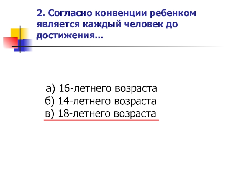 2. Согласно конвенции ребенком является каждый человек до достижения...