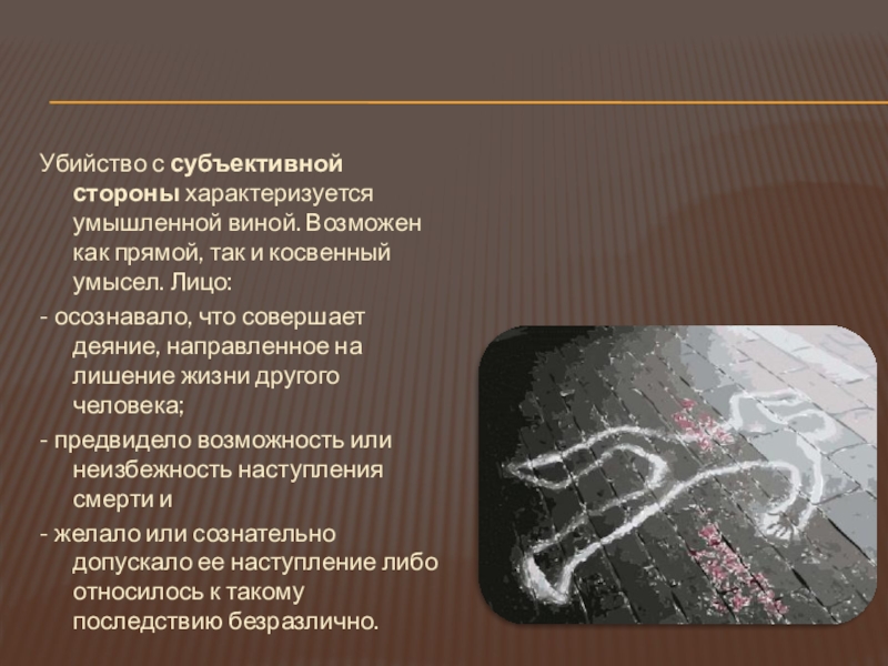 Слайд 6Убийство с субъективной стороны характеризуется умышленной виной. Возможен как прямой, так